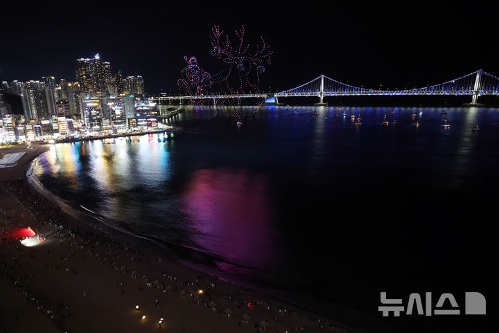 [부산=뉴시스] 하경민 기자 = 21일 부산 수영구 광안리해수욕장 일대에서 '미리 메리크리스마스'를 주제로 한 '광안리 M 드론라이트쇼'가 펼쳐지고 있다. 2025.12.21. [email protected]