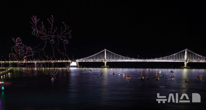[부산=뉴시스] 하경민 기자 = 21일 부산 수영구 광안리해수욕장 일대에서 '미리 메리크리스마스'를 주제로 한 '광안리 M 드론라이트쇼'가 펼쳐지고 있다. 2025.12.21. [email protected]