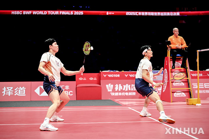 [항저우=신화/뉴시스] 김원호(오른쪽)와 서승재가 21일(현지 시간) 중국 저장성 항저우 올림픽스포츠센터에서 열린 2025 세계배드민턴연맹(BWF) 월드투어 파이널스 남자 복식 결승에서 중국의 량웨이컹-왕창 조를 경기하고 있다. 김원호-서승재 조가 2-0(21-18 21-14)으로 승리하고 우승하며 '시즌 11승'을 달성했다. 2025.12.22.