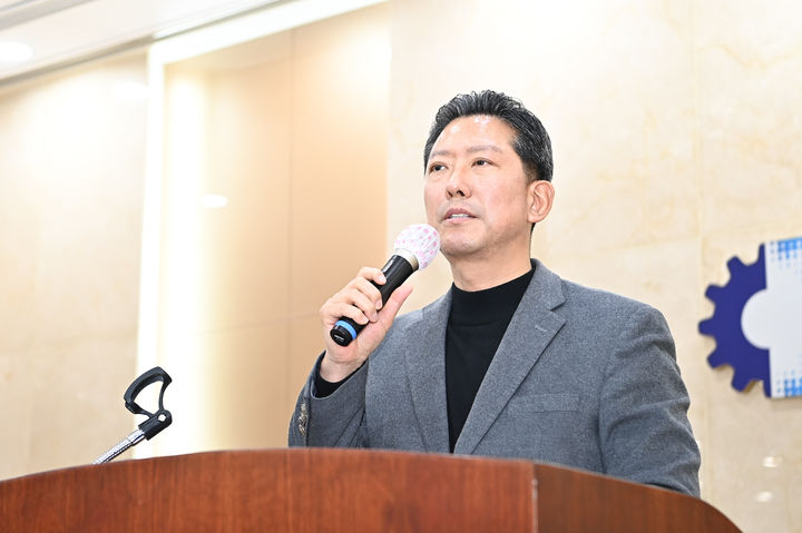 [구미=뉴시스] 박홍식 기자 = 김장호 경북 구미시장이 22일 구미상공회의소 강당에서 열린 '신공항 배후도시를 향한 구미~신공항' 철도 신설 정책 토론회에서 발언하고 있다. (사진=구미시 제공) 2025.12.22 [email protected]
