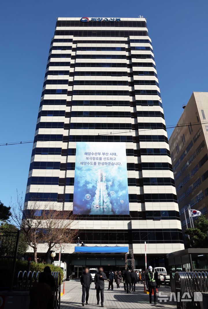 [부산=뉴시스] 하경민 기자 = 해양수산부 임시청사 개청식을 앞둔 22일 부산 동구 해수부 본관 건물 외벽에 대형 현수막이 걸려 있다. 2025.12.22. [email protected]