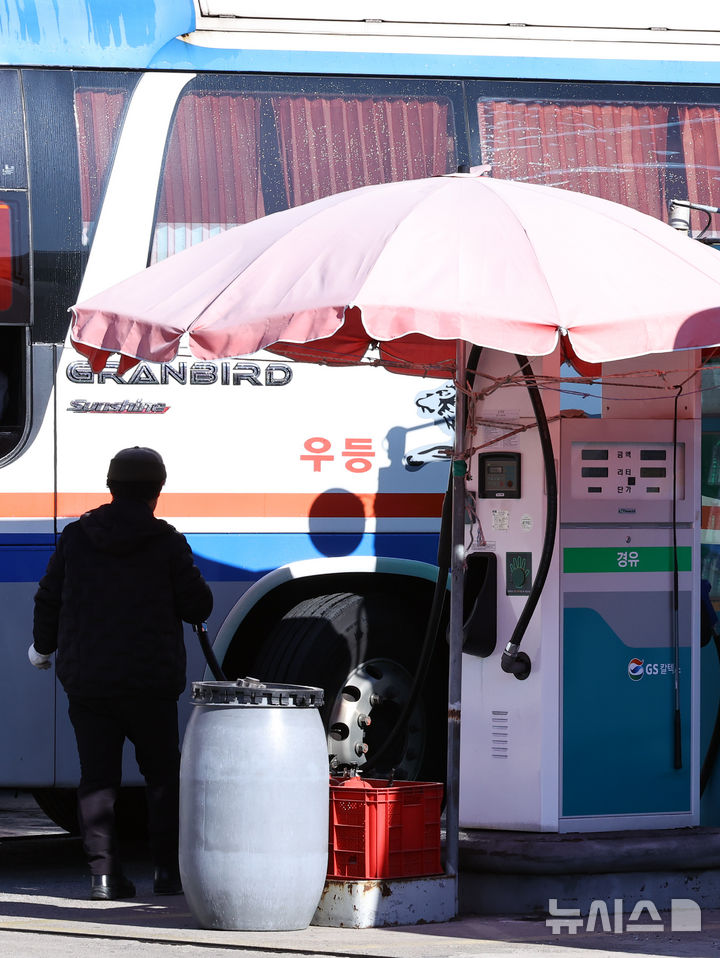 [서울=뉴시스] 최진석 기자 = 정부가 유류세 인하 및 경유·압축천연가스(CNG) 유가연동보조금 지급을 내년 2월 말까지 연장하는 방안을 검토하고 있는 22일 서울 고속버스터미널 내 주유소에서 관계자가 고속버스에 주유하고 있다. 2025.12.22. [email protected]