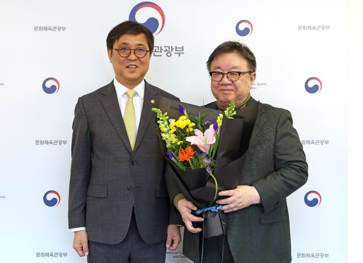 [서울=뉴시스] 최휘영 문화체육관광부 장관이 22일 서울 종로구 국립현대미술관 서울관에서 강헌 한국문화예술교육진흥원 이사장에게 임명장을 수여한 뒤 기념 촬영을 하고 있다. (사진=문화체육관광부 제공) 2025.12.22. [email protected] *재판매 및 DB 금지