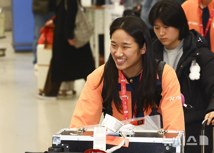 [인천공항=뉴시스] 김근수 기자 = 배드민턴 역대 단식 단일 시즌 최다승(11승)을 기록한 안세영이 22일 인천 중구 인천국제공항 제1여객터미널으로 2025 세계배드민턴연맹(BWF) 월드 투어 파이널 대회를 마치고 귀국하고 있다. 2025.12.22. [email protected]