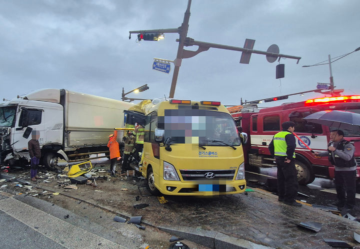 [김제=뉴시스] 23일 오후 전북 김제시 백산면 한 교차로에서 초등학생 통학용 버스와 윙바디 화물차량이 부딪혀 소방대원들이 사고 수습에 나서고 있다. (사진=전북특별자치도소방본부 제공) 2025.12.23. [email protected]
