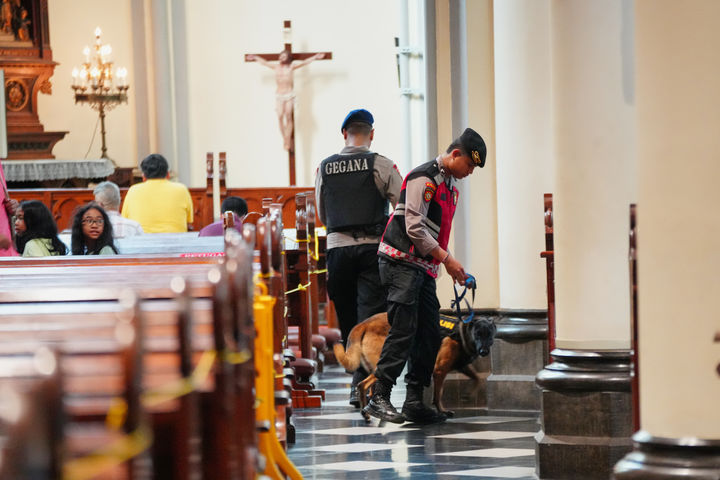 [자카르타=AP/뉴시스] 23일(현지 시간) 인도네시아 자카르타의 성모마리아 승천 대성당에서 열리는 크리스마스 미사를 앞두고 경찰 K9 부대가 테러 방지 등을 위해 성당 내부를 점검하고 있다. 2025.12.23.