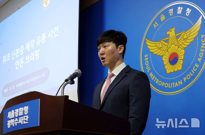 [서울=뉴시스] 홍효식 기자 = 23일 서울 마포구 서울경찰청 광역수사단에서 마약범죄수사대 국제범죄수사1계 김성호 경정이 외국인 대상 외국인 등록증 및 건설 관련 자격증 위조·판매·의뢰 피의자 75명 검거 브리핑을 하고 있다. 2025.12.23. [email protected]