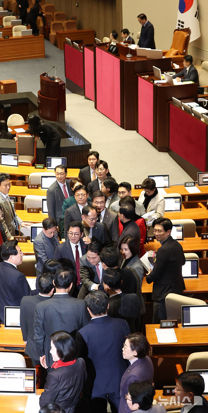 [서울=뉴시스] 김금보 기자 = 장동혁 국민의힘 대표가 23일 서울 여의도 국회에서 열린 제430회국회(임시회) 제2차 본회의에서 '내란전담재판부설치 관련 법안'에 대한 반대 무제한토론(필리버스터)을 마친 뒤 의원들에게 격려를 받고 있다. 2025.12.23. [email protected]