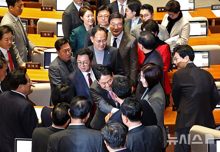 [서울=뉴시스] 김금보 기자 = 장동혁 국민의힘 대표가 23일 서울 여의도 국회에서 열린 제430회국회(임시회) 제2차 본회의에서 '내란전담재판부설치 관련 법안'에 대한 반대 무제한토론(필리버스터)을 마친 뒤 의원들에게 격려를 받고 있다. 2025.12.23. [email protected]