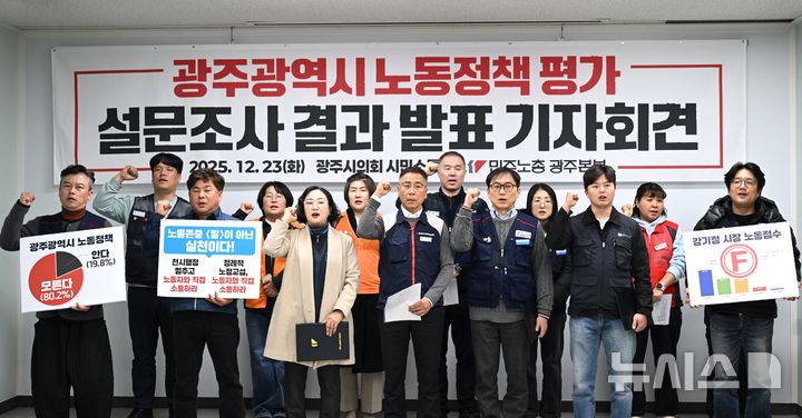 [광주=뉴시스] 이현행 기자 = 민주노총광주본부가 23일 오후 광주 서구 치평동 광주시의회 시민소통실에서 '광주시 노동정책 평가 발표' 기자회견을 하고 있다. 2025.12.23. [email protected]