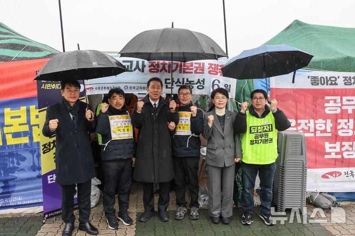 [서울=뉴시스] 조성봉 기자= 공무원, 교사 정치기본권 쟁취를 요구하며 6일째 단식농성 중인 이해준 전국공무원노조 위원장과 박영환 전교조 위원장이 23일 오후 국회 앞 농성장을 찾은 더불어민주당 김병기 원내대표와 문진석 원내운영수석부대표 등과 면담을 마치고 기념촬영을 하고 있다. 왼쪽부터 문 원내운영수석부대표, 박 위원장, 김 원내대표, 이 위원장, 전종덕 진보당 의원, 박중배 전국공무원노조 수석부위원장. (사진=전국공무원노조 제공) 2025.12.23. [email protected]
