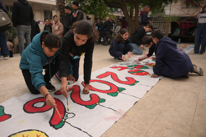 [가자시티=AP/뉴시스] 23일(현지 시간) 가자지구 가자시티의 한 성당 앞에서 팔레스타인 청소년들이 성탄절을 앞두고 성당을 꾸밀 크리스마스 장식을 만들고 있다. 2025.12.24.