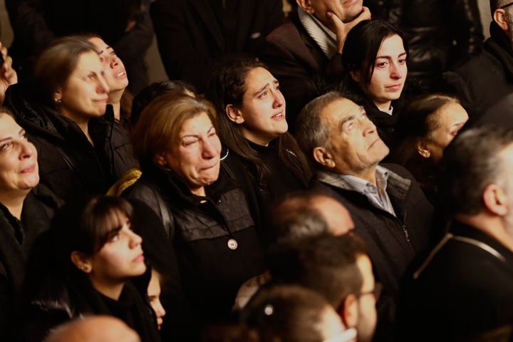 [다마스쿠스=AP/뉴시스] 23일(현지 시간) 시리아 다마스쿠스 드웨일라 마을에 있는 그리스정교회 성엘리아스 성당에서 크리스마스트리 점등식이 열려 일부 참석자들이 눈물을 흘리고 있다. 이 성당에서는 지난 6월 이슬람국가(ISIS)의 자살폭탄 테러로 최소 20명이 숨지고 50여 명이 부상한 바 있다. 2025.12.24.