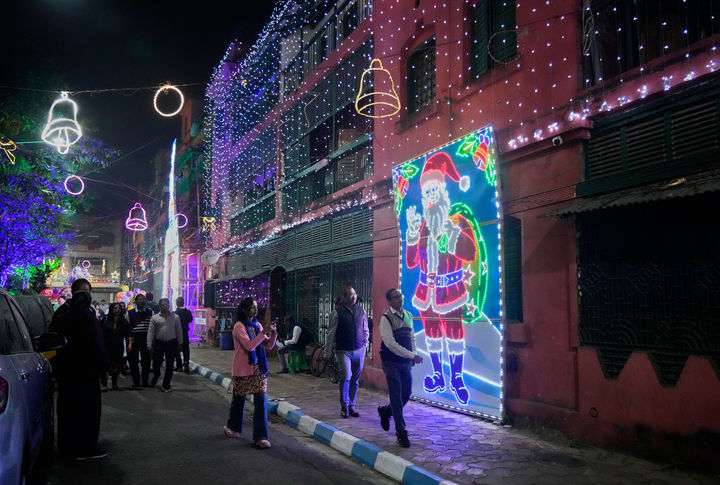 [콜카타=AP/뉴시스] 23일(현지 시간) 인도 콜카타의 보우 배럭 주택가에서 시민과 관광객들이 크리스마스 장식이 된 거리를 거닐고 있다. 보우 배럭은 영국 식민지 시대부터 이어져 온 전통 주거지로 제1차 세계대전 당시에는 군인들이 이곳에 거주하기도 했다. 2025.12.24.