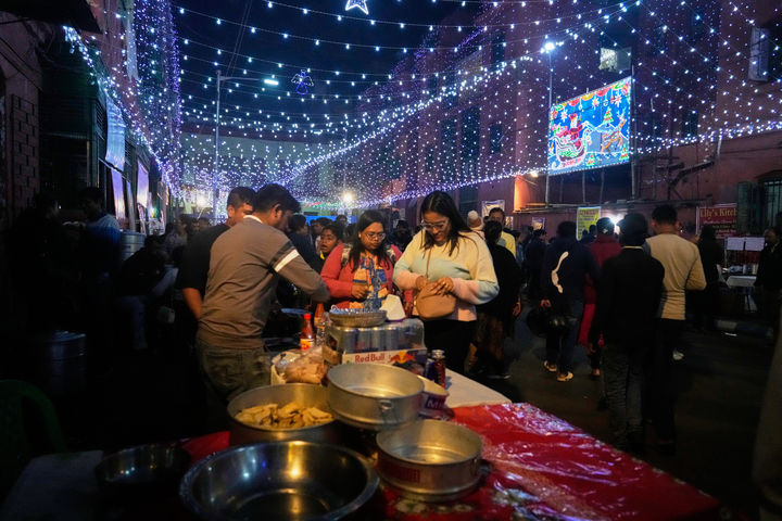[콜카타=AP/뉴시스] 23일(현지 시간) 인도 콜카타의 보우 배럭 주택가 거리에서 시민과 관광객들이 거리 음식을 사고 있다. 보우 배럭은 영국 식민지 시대부터 이어져 온 전통 주거지로 제1차 세계대전 당시에는 군인들이 이곳에 거주하기도 했다. 2025.12.24.