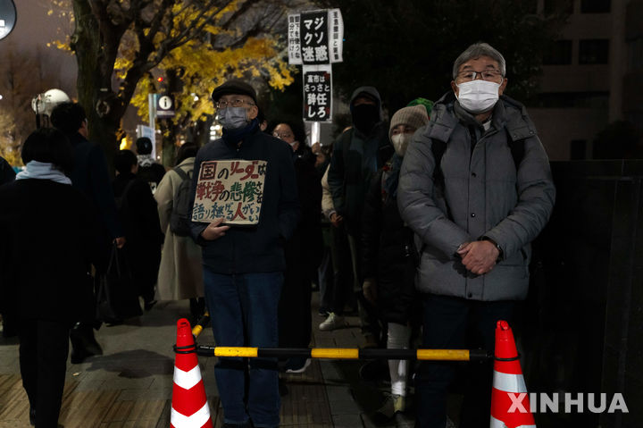 [도쿄=신화/뉴시스] 23일 일본 도쿄의 총리 관저 앞에서 시민들이 피켓을 들고 시위하고 있다. 시위대는 다카이치 사나에 총리의 대만 관련 발언 철회와 핵무장 필요성을 주장한 정부 고위 관계자의 발언을 비판하며 집회를 열었다. 2025.12.24.