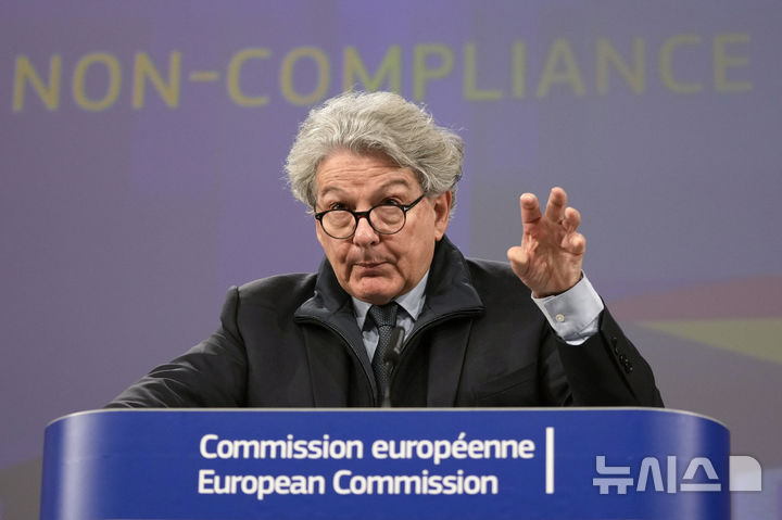 [브뤼셀(벨기에)=AP/뉴시스]티에리 브레통 유럽연합(EU) 디지털담당 집행위원(당시)이 2024년 3월25일 브뤼셀의 EU 본부에서 열린 디지털서비스(DSA)법 관련 기자회견에서 연설하고 있다. 미 국무부는 23일(현지시각) 미 기술 기업들이 미국인의 견해를 검열하거나 억압하도록 압력을 가한 혐의로 기소된 브레통 등 5명의 유럽인의 미국 입국을 금지한다고 발표했다. 2025.12.24.