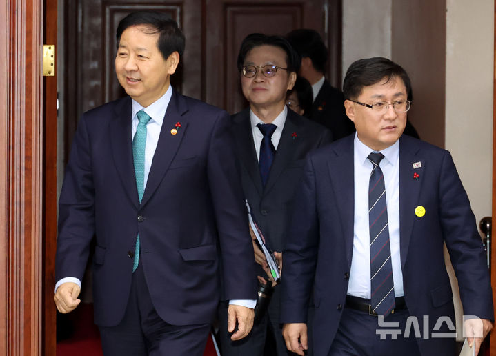 [서울=뉴시스] 추상철 기자 = 구윤철 부총리 겸 기획재정부 장관과 김성환 기후에너지환경부 장관이 24일 오전 서울 종로구 정부서울청사에서 열린 경제관계장관회의 겸 산업경쟁력강화 관계장관회의에 참석하고 있다. 2025.12.24. [email protected]