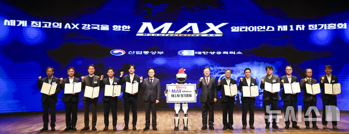 [서울=뉴시스] 정병혁 기자 = 김정관 산업통상부 장관을 비롯한 참석자들이 24일 서울 중구 대한상공회의소에서 열린 M.AX 얼라이언스 정기총회에서 기념촬영을 하고 있다. 2025.12.24. [email protected]