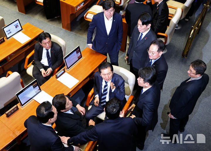 [서울=뉴시스] 김금보 기자 = 정청래 더불어민주당 대표가 24일 서울 여의도 국회에서 열린 제430회국회(임시회) 제2차 본회의에서 의원들과 논의를 하고 있다. 2025.12.24. [email protected]