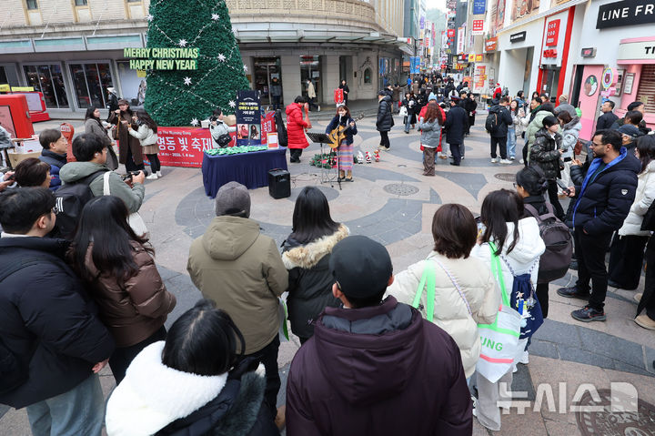 [서울=뉴시스] 권창회 기자 = 크리스마스 이브인 24일 오후 서울 중구 명동거리에서 가수 강예영과 심가원이 공연을 하고 있다. 2025.12.24. [email protected]