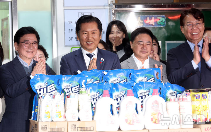 [부산=뉴시스] 하경민 기자 = 정청래 더불어민주당 대표가 24일 오후 부산 동래구 아동복지시설 새들원을 방문, 관계자들과 기념사진을 찍고 있다. 2025.12.24. [email protected]