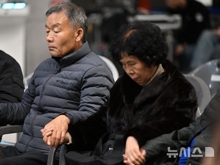 [무안=뉴시스] 이현행 기자 = 12·29 무안공항 제주항공 여객기 참사 1주기를 닷새 앞둔 24일 오후 전남 무안군 무안국제공항에서 열린 여객기 참사 1주기 '토닥허그 나눔의 밤' 추모 행사에 참여한 한 유가족들이 두손을 맞잡고 있다. 2025.12.24. [email protected]