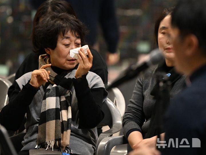 [무안=뉴시스] 이현행 기자 = 12·29 무안공항 제주항공 여객기 참사 1주기를 닷새 앞둔 24일 오후 전남 무안군 무안국제공항에서 열린 여객기 참사 1주기 '토닥허그 나눔의 밤' 추모 행사에 참여한 한 유가족이 강연을 듣고 눈물을 흘리고 있다. 2025.12.24. [email protected]