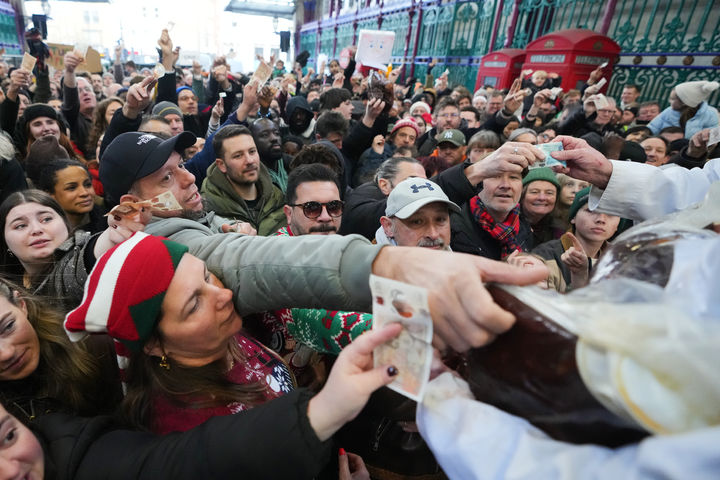 [런던=AP/뉴시스] 24일(현지 시간) 영국 런던의 스미스필드 시장에서 열린 연례 '성탄 전야 고기 경매'에서 시민들이 돈을 들고 경매에 응하고 있다. 스미스필드 시장은 런던의 유명 고기 도매 시장 중 한 곳으로 '성탄 경매'에서는 시민들이 경매에 참여해 성탄절을 지낼 고기를 직접 구매한다. 2025.12.25.