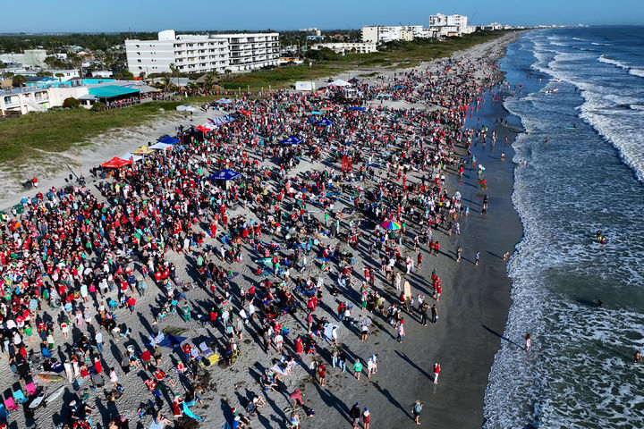 [코코아비치=AP/뉴시스] 24일(현지 시간) 미 플로리다주 코코아비치에서 크리스마스 이브를 맞아 열린 연례 ‘서핑 산타’ 행사에 산타 복장의 참가자들이 모여들고 있다. 2025.12.25.