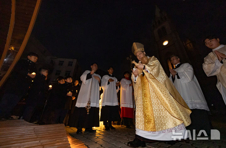 [서울=뉴시스] 황준선 기자 = 천주교 서울대교구장 정순택 대주교가 성탄절인 25일 서울 중구 명동대성당 앞마당에서 주님 성탄 대축일 밤 미사를 앞두고 아기 예수를 말 구유에 안치하는 '구유 예절' 의식을 하고 있다. 2025.12.25. [email protected]