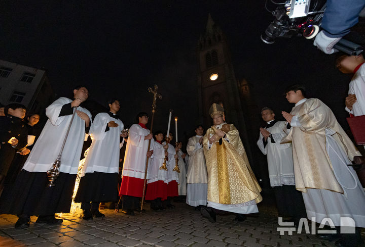 [서울=뉴시스] 황준선 기자 = 천주교 서울대교구장 정순택 대주교가 성탄절인 25일 서울 중구 명동대성당 앞마당에서 주님 성탄 대축일 밤 미사를 앞두고 아기 예수를 말 구유에 안치하는 '구유 예절' 의식을 하고 있다. 2025.12.25. [email protected]