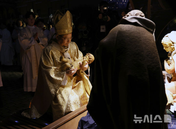 [서울=뉴시스] 황준선 기자 = 천주교 서울대교구장 정순택 대주교가 성탄절인 25일 서울 중구 명동대성당 앞마당에서 주님 성탄 대축일 밤 미사를 앞두고 아기 예수를 말 구유에 안치하는 '구유 예절' 의식을 하고 있다. (공동취재) 2025.12.25. [email protected]
