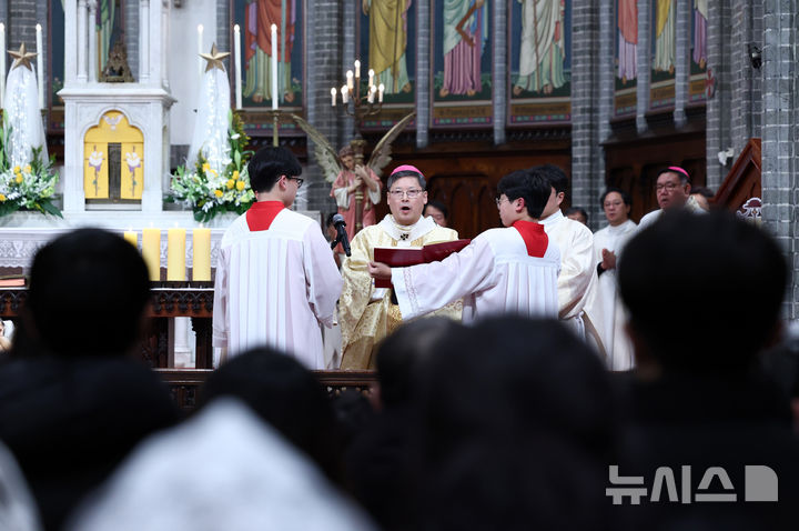 [서울=뉴시스] 황준선 기자 = 천주교 서울대교구장 정순택 대주교가 성탄절인 25일 서울 중구 명동대성당에서 주님 성탄 대축일 밤 미사를 집전하고 있다. (공동취재) 2025.12.25. [email protected]