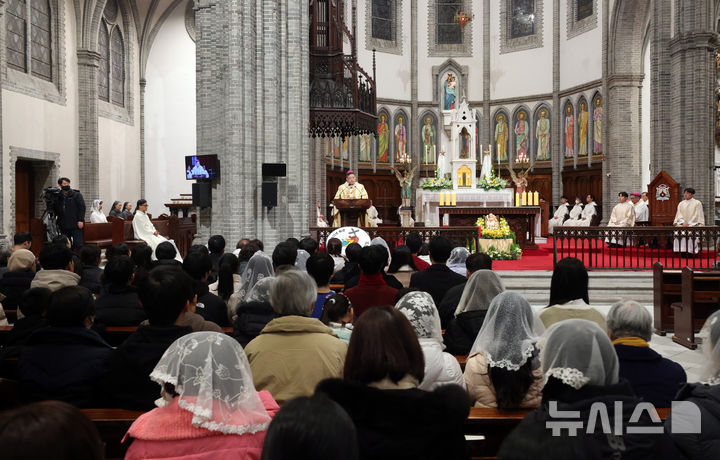 [서울=뉴시스] 황준선 기자 = 천주교 서울대교구장 정순택 대주교가 성탄절인 25일 서울 중구 명동대성당에서 주님 성탄 대축일 밤 미사를 집전하고 있다. (공동취재) 2025.12.25. [email protected]