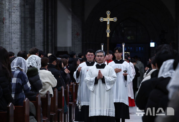 [서울=뉴시스] 황준선 기자 = 25일 서울 중구 명동대성당에서 열린 주님 성탄 대축일 밤 미사에 사제들이 입장하고 있다. (공동취재) 2025.12.25. [email protected]