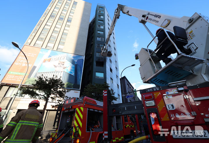 [서울=뉴시스] 김근수 기자 = 25일 서울 중구 충무로역 인근 건물에서 발생한 화재로 출동한 소방대원이 진화작업을 하고 있다. 2025.12.25. [email protected]
