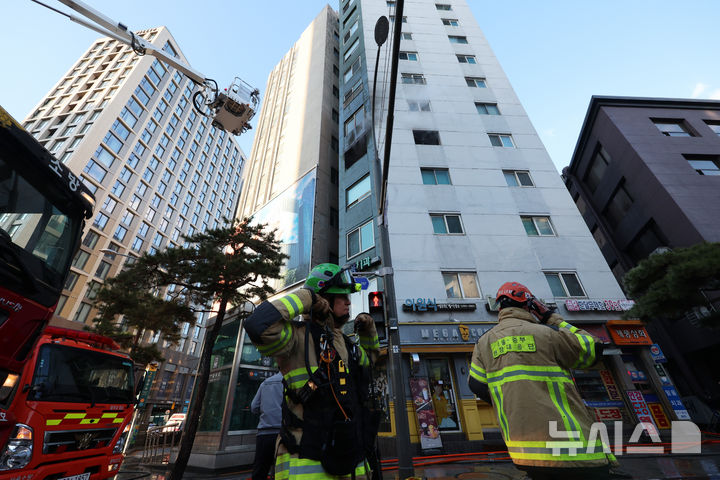 [서울=뉴시스] 김근수 기자 = 25일 서울 중구 충무로역 인근 건물에서 발생한 화재로 출동한 소방대원이 진화작업을 하고 있다. 2025.12.25. [email protected]