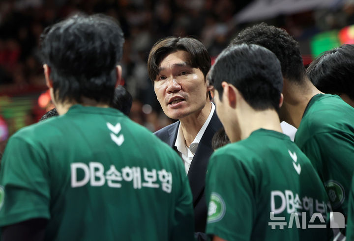 [안양=뉴시스] 김선웅 기자 = 25일 경기 안양시 정관장 아레나에서 열린 2025-2026 프로농구 안양 정관장 vs 원주 DB의 경기, 원주 김주성 감독이 선수들과 작전을 논의하고 있다. 2025.12.25. [email protected]