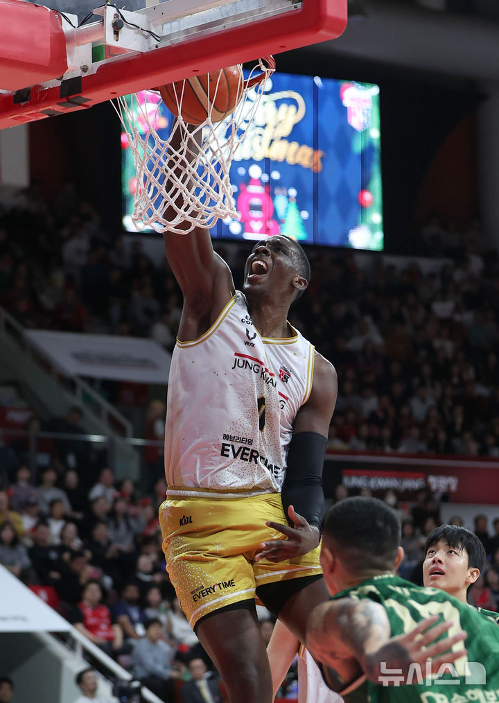 [안양=뉴시스] 김선웅 기자 = 25일 경기 안양시 정관장 아레나에서 열린 2025-2026 프로농구 안양 정관장 vs 원주 DB의 경기, 안양 오브라이언트가 덩크슛을 성공시키고 있다. 2025.12.25. [email protected]