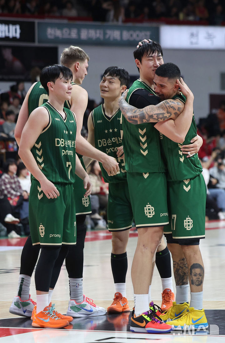 [안양=뉴시스] 김선웅 기자 = 25일 경기 안양시 정관장 아레나에서 열린 2025-2026 프로농구 안양 정관장 vs 원주 DB의 경기, 69-63으로 안양에 승리를 거둔 원주 선수들이 기뻐하고 있다. 2025.12.25. [email protected]