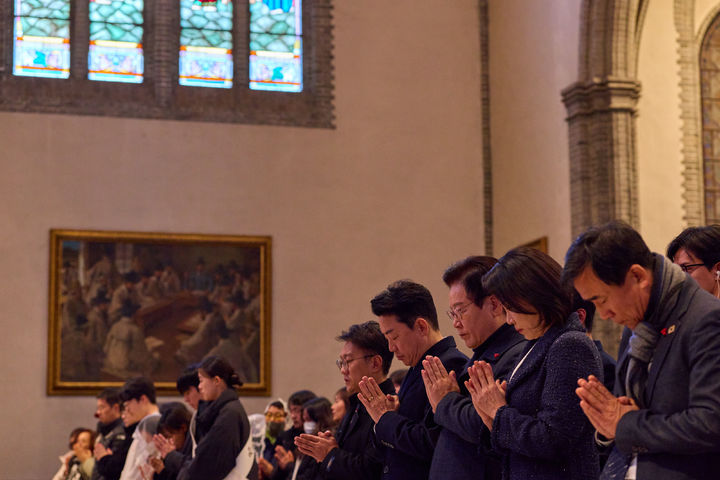 [서울=뉴시스] 최동준 기자 = 이재명 대통령과 김혜경 여사가 25일 서울 명동성당에서 열린 성탄 미사에 참석해 강훈식 비서실장, 김남준 대변인 등과 함께 기도하고 있다. (사진=대통령실 제공) 2025.12.25. [email protected] *재판매 및 DB 금지