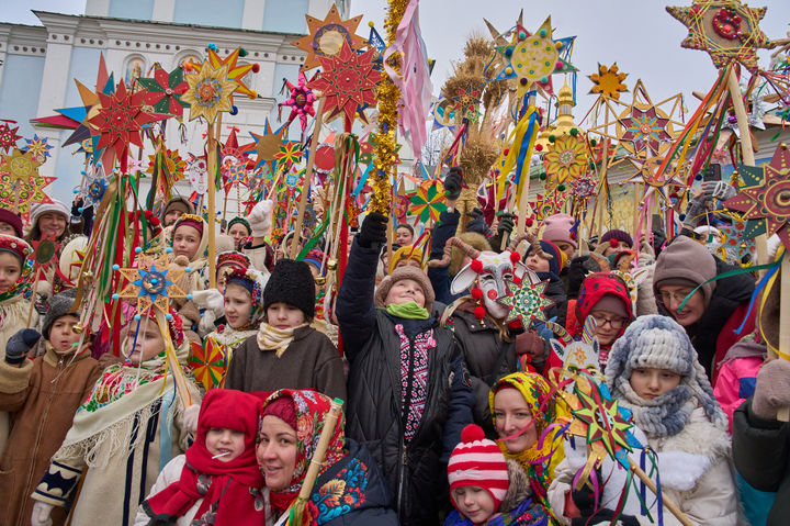 [키이우=AP/뉴시스] 25일(현지 시간) 우크라이나 키이우의 성 미카엘 황금돔 수도원 인근에서 일부 전통 의상을 입은 시민들이 베들레헴의 별을 들고 성탄절을 축하하고 있다. 우크라이나는 2023년 러시아와 문화·종교 분리를 위해 전통 크리스마스를 1월 7일에서 12월 25일로 공식 변경했다. 2025.12.26.