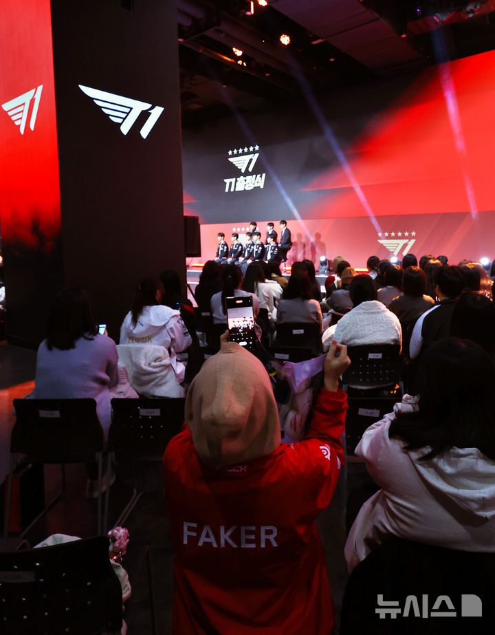 [서울=뉴시스] 박주성 기자 = 26일 오후 서울 잠실DN콜로세움에서 열린 T1 LoL 2026 시즌 출정식에 감독, 코칭스테프, 선수들이 참석하고 있다. 2025.12.26. [email protected]
