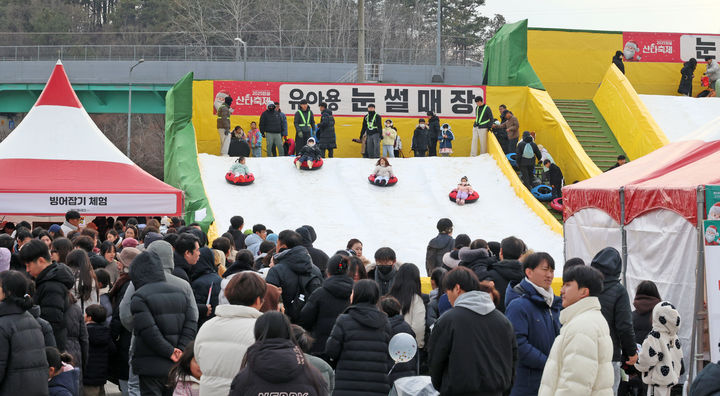 [임실=뉴시스] 김종효 기자 = '2025 임실 산타축제'가 열리고 있는 27일 임실치즈테마파크, 축제장 대표 체험시설인 눈썰매장에 많은 인파가 몰려 있다. (사진=임실군 제공) 2025.12.27. [email protected]