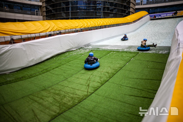 [서울=뉴시스] 정병혁 기자 = 27일 송파구 가든파이브 중앙광장에 마련된 2025 하하호호 눈썰매장을 찾은 어린이들이 썰매를 타고 있다. 2025.12.27. [email protected]