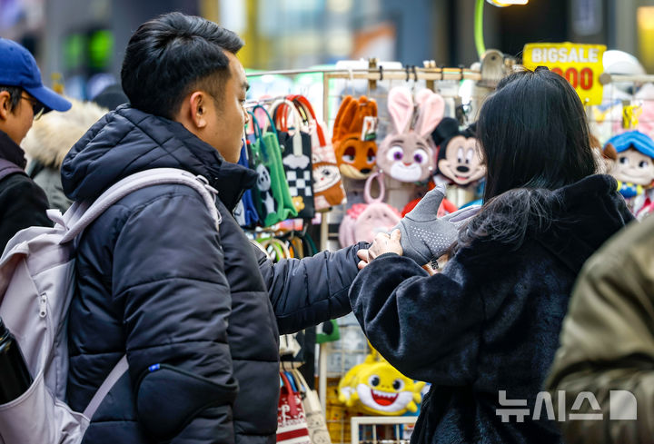 [서울=뉴시스] 정병혁 기자 = 한파주의보가 해제된 27일 서울 중구 명동을 찾은 여행객들이 장갑을 구매하고 있다. 2025.12.27. [email protected]