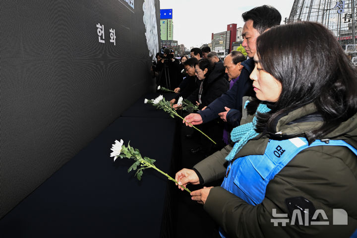 [광주=뉴시스] 이영주 기자 = 12·29 제주항공 여객기 참사 1주기를 이틀 앞둔 27일 오후 광주 동구 5·18민주광장에서 열린 광주·전남시민추모대회에서 김유진(맨앞) 12·29 무안공항 제주항공 여객기 참사 유가족 협의회 대표를 비롯한 내빈들이 희생자들을 향해 헌화하고 있다. 2025.12.27. [email protected]
