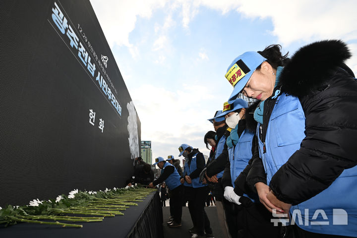 [광주=뉴시스] 이영주 기자 = 12·29 제주항공 여객기 참사 1주기를 이틀 앞둔 27일 오후 광주 동구 5·18민주광장에서 열린 광주·전남시민추모대회에서 참사 유가족들이 희생자들을 향해 헌화하고 있다. 2025.12.27. [email protected]