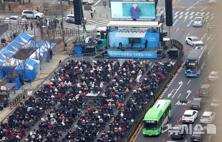 [서울=뉴시스] 홍효식 기자 = 전광훈 사랑제일교회 목사가 28일 서울 중구 세종대로에서 열린 전국 주일 연합 예배에서 설교하고 있다. 2025.12.28. [email protected]